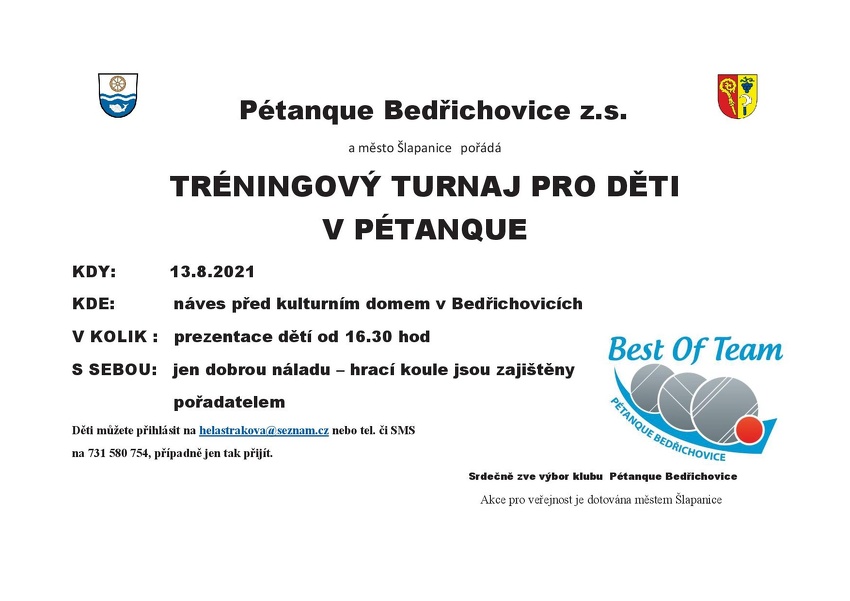 Pétanque Bedřichovice pořádá tréningový pétanque turnaj pro děti. Prezentace hráčů proběhne v 16:30 hod.