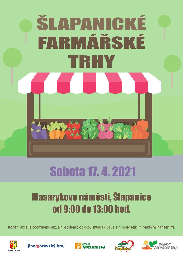Město Šlapanice Vás zde na farmářské trhy v sobotu 17. dubna 2021 od 9:00 do 13:00 hod. na Masarykově náměstí.