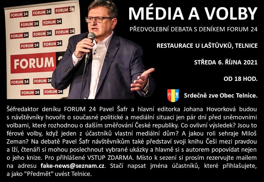 Šéfredaktor deníku FORUM 24 Pavel Šafr a hlavní editorka Johana Hovorková budou s návštěvníky hovořit o současné politické a mediální situaci.