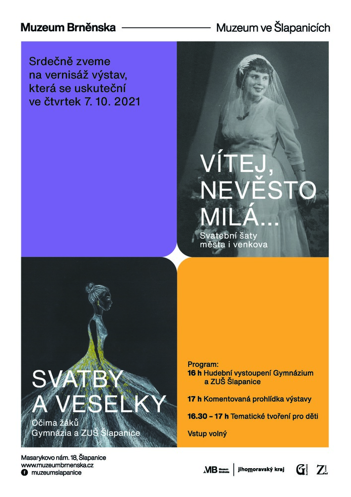 Srdečně Vás zveme na vernisáž výstav Vítej, nevěsto milá... Svatební šaty města i venkova a Svatby a veselky očima žáků Gymnázia a ZUŠ Šlapanice.