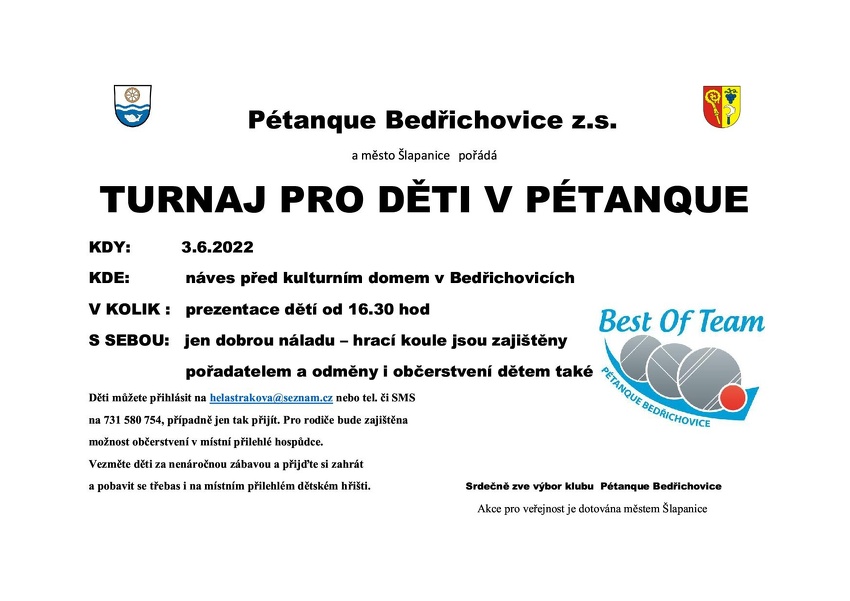 Pétanque Bedřichovice z.s. a město Šlapanice zvou děti na Turnaj v pétanque.