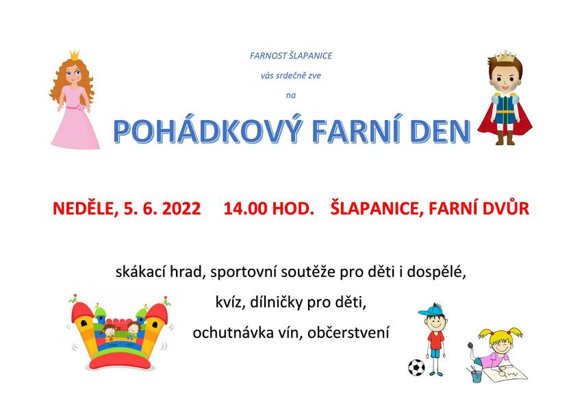 Srdečně vás zveme na Pohádkový farní den, který se koná v neděli 5. června 2022 ve 14 hodin na farním dvoře.