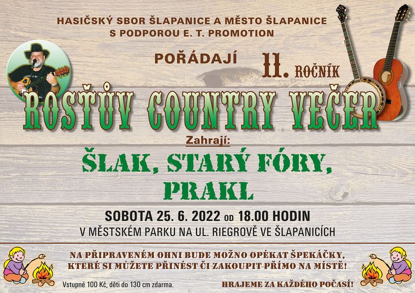 Hasičský sbor Šlapanice a město Šlapanice vás srdečně zvou na Rosťův Country večer. Na 11. ročníku se představí kapely Šlak, Starý fóry a Prakl. Děti i dospělí si na připraveném ohni budou moci opéct vlastní či na místě zakoupené špekáčky.