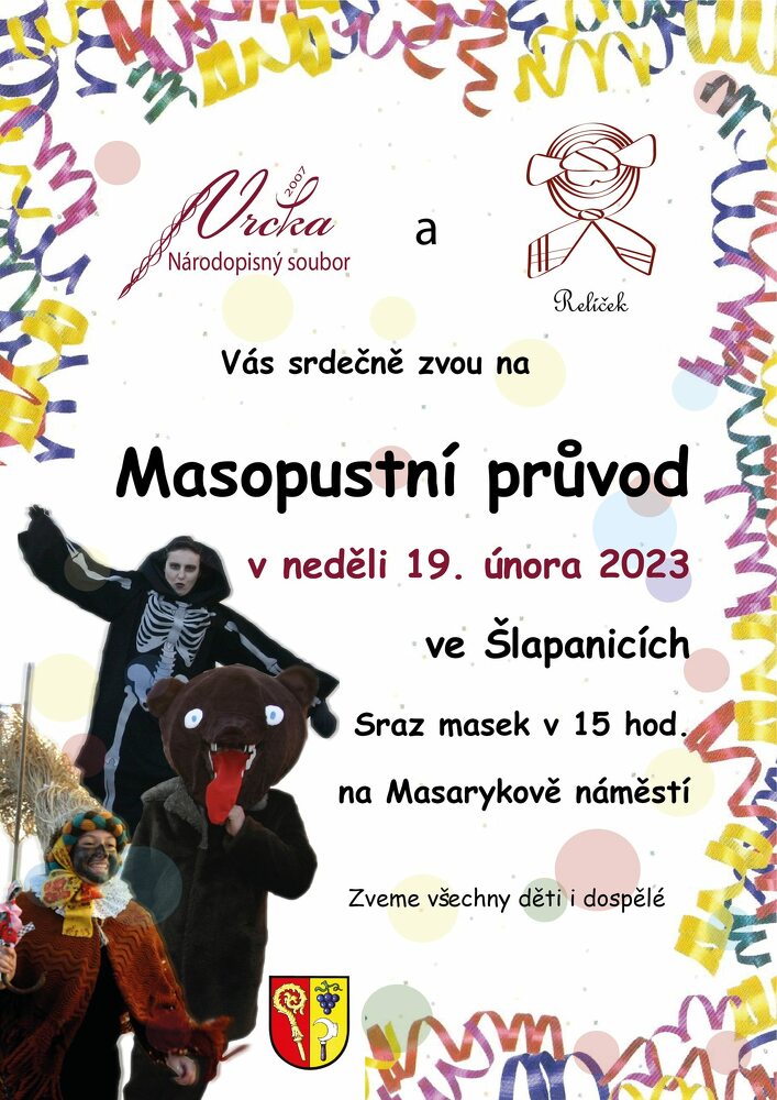Národopisný soubor Vrčka a Relíček vás srdečně zvou na Masopustní průvod. Sraz masek v 15 hodin na Masarykově náměstí.