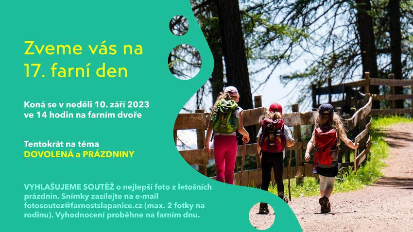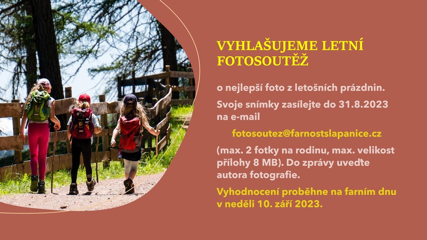 Odpoledne plné bohatého programu se koná v neděli 10. září 2023 ve 14 hodin na farním dvoře. Zapojit se můžete i do soutěže o nejlepší foto z letošních prázdnin. svoje snímky zasílejte do 31. 8. 2023 na e-mail fotosoutez@farnostslapnice.cz.