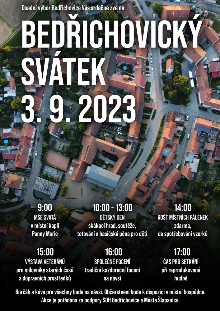 Srdečně zveme v neděli 3. září 2023 na Obecní svátek v Bedřichovicích. Od 10 hodin bude připraven bohatý program i zábava pro děti. Nebude chybět košt místních pálenek, výstava veteránů a samozřejmě tradiční společné focení občanů Bedřichovic.