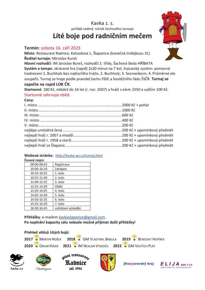 Spolek Kavka zve registrované i neregistrované příznivce královské hry na sedmý ročník šachového turnaje Líté boje pod radničním mečem, který se koná v sobotu 16. září 2023 v sále restaurace Radnice.
