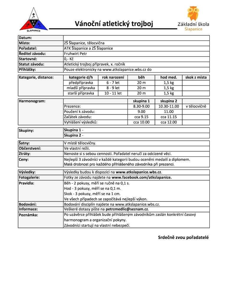 ATK Šlapanice Vás zve na tradiční vánoční atletický trojboj v neděli od 9. 00 na ZŠ Šlapanice.