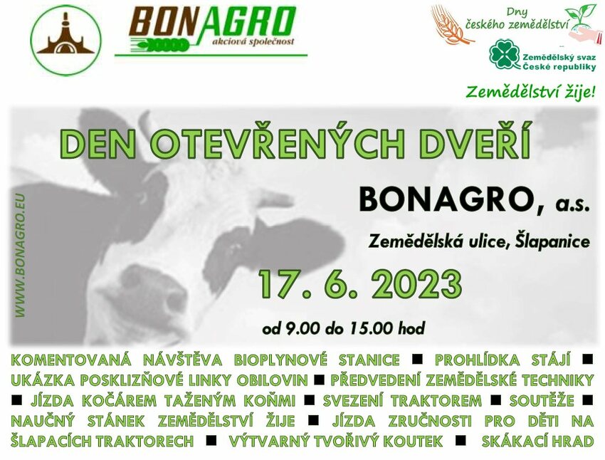 BONAGRO, a.s. zve na Den otevřených dveří, který proběhne v sobotu 17. června 2022 od 9 do 15 hodin v areálu Zemědělská 1, Šlapanice. Čeká vás komentovaná návštěva bioplynové stanice, prohlídka stájí, jízda kočárem nebo traktorem, soutěže a další program nejen pro děti.
