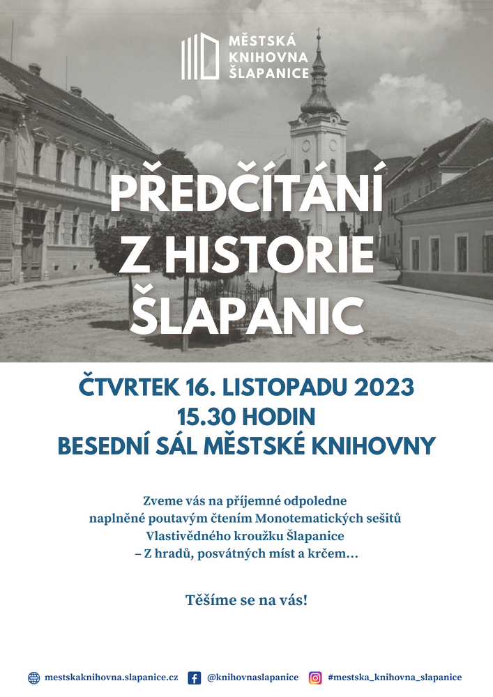 Pokud se chcete dozvědět o Šlapanicích plno historických zajímavostí přijďte 16. listopadu v 15.30 do naší knihovny v parku.