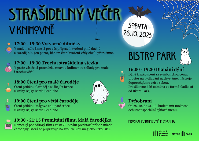 Navštivte v sobotu 28.října strašidelný večer v knihovně. Čekaá vás strašidelná stezka, výtvarné dílničky, čtení pro čaroděje a promítání filmu.Od 16.00 si můžete vydlabat svou dýni a ochutnat speciální dýňové menu.