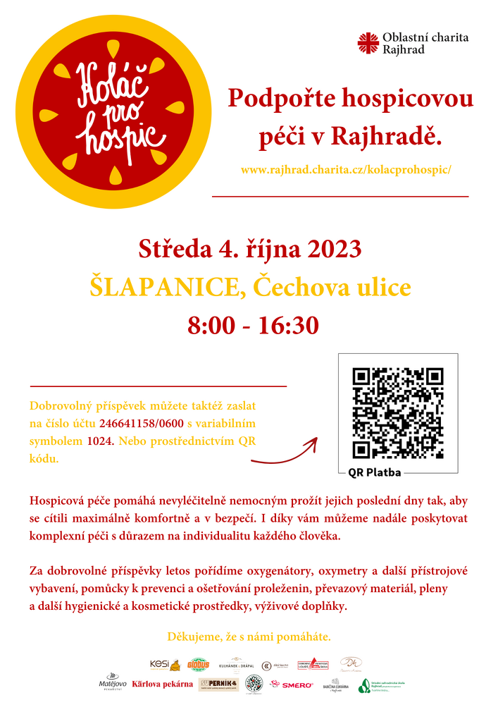 SBÍRKA KOLÁČ PRO HOSPIC – TRADICE, KTERÁ CHUTNÁ. Hospic zajišťuje pacientům péči, úlevu od bolesti a důstojnost v závěru jejich života. Dárci mohou letos podpořit lůžkový a mobilní hospic v Rajhradě 4. října 2023 na již tradiční sbírce Koláč pro hospic.