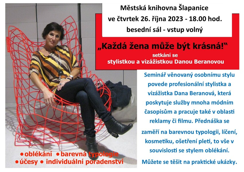 Městská knihovna Šlapanice Vás zve 26. října 2023 od 18 hodin do besedního sálu na setkání se stylistkou a vizážistkou Danou Beranovou.