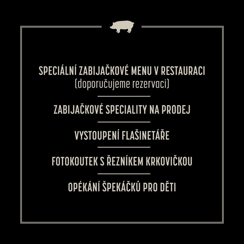 Už tuto sobotu vás Bistro Park zve od 10 do 16 hodin na tradiční komentovanou zabijačku Čeká vás skvělá zábava, speciální zabijačkové menu, vystoupení flašinetáře, foto koutek a opékání špekáčků pro děti.
