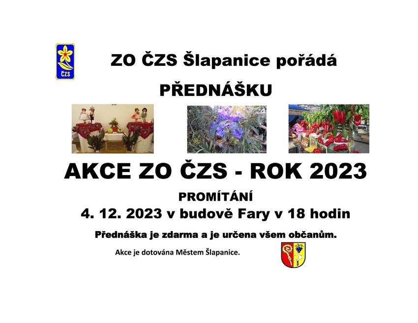 ZO ČZS Šlapanice pořádá 4. 12. 2023 v budově Fary v 18 hodin přednášku na téma Akce ZO ČZS - ROK 2023. Přednáška je zdarma a je určena všem občanům.