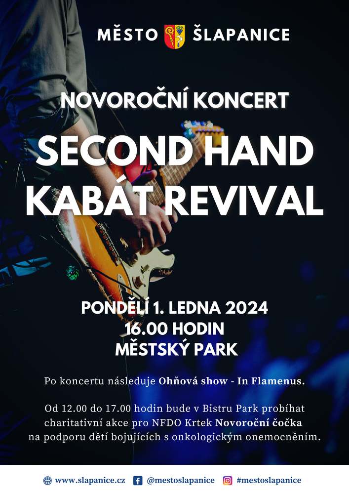 Přivítejme Nový rok s hity kapely Kabát. Koncert začíná v 16 hodin v městském parku. Po koncertě nás čeká i ohňová show skupiny In Flamenus.