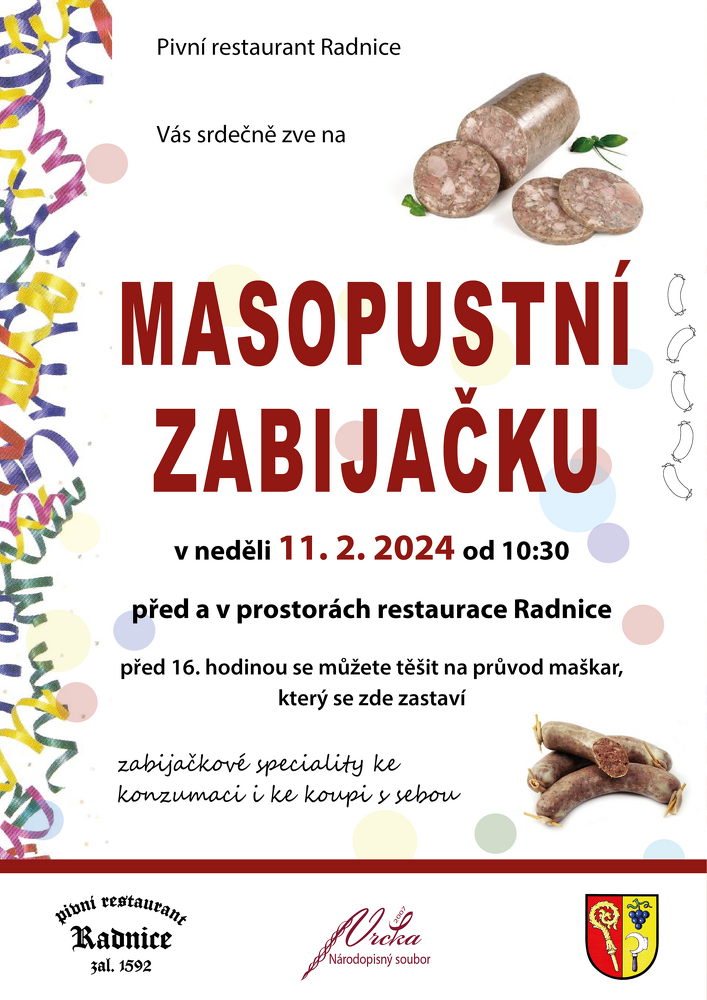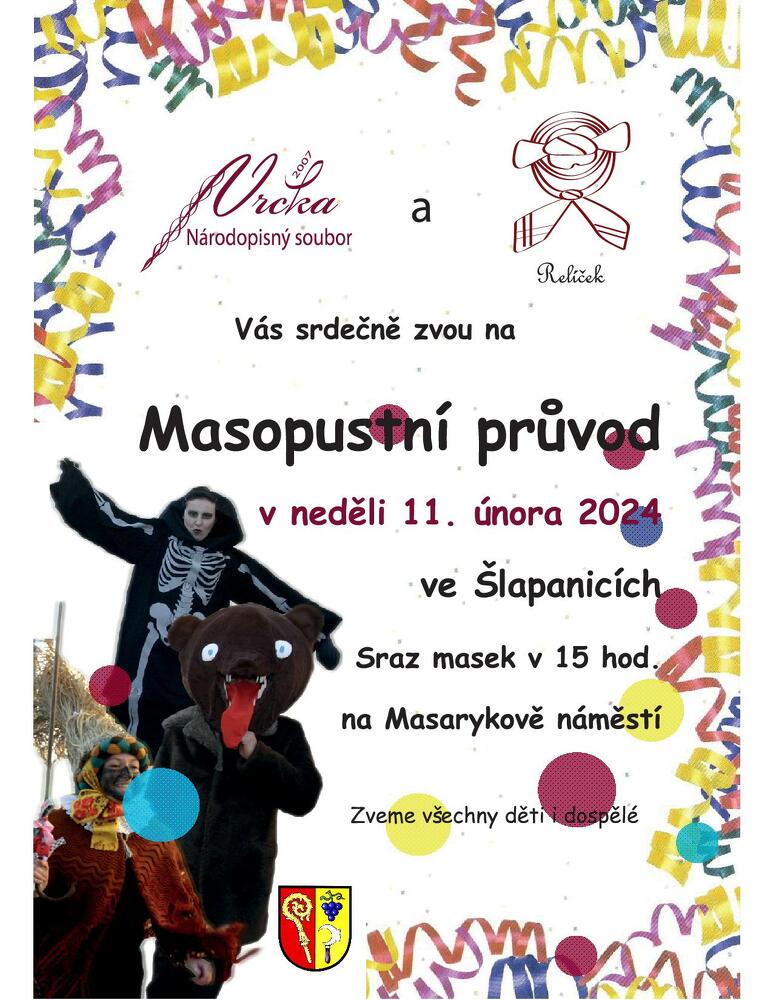 Masopustní průvod pro všechny děti a dospělé. Sejdeme se 11.2.2024 v 15 hodin na Masarykově náměstí.