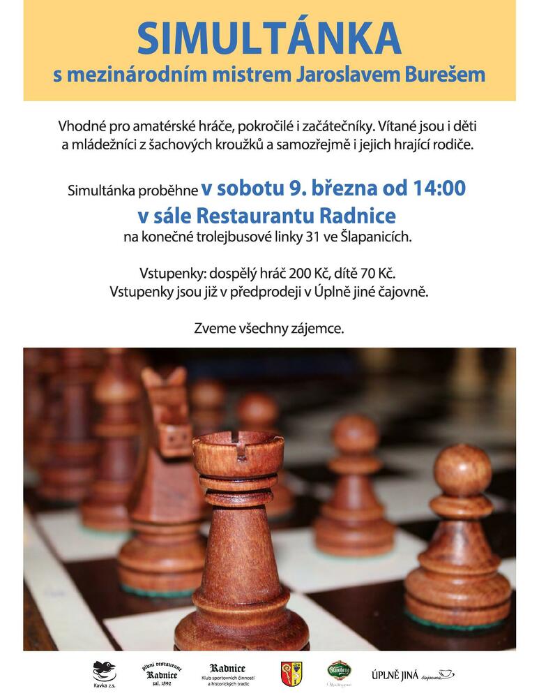 Pokud jste ve světě šachů amatérský hráč, pokročilý nebo jen začátečník... Neváhejte se zúčastnit v sobotu 9.března od 14 hodin simultánky s mezinárodním mistrem Jaroslavem Burešem.