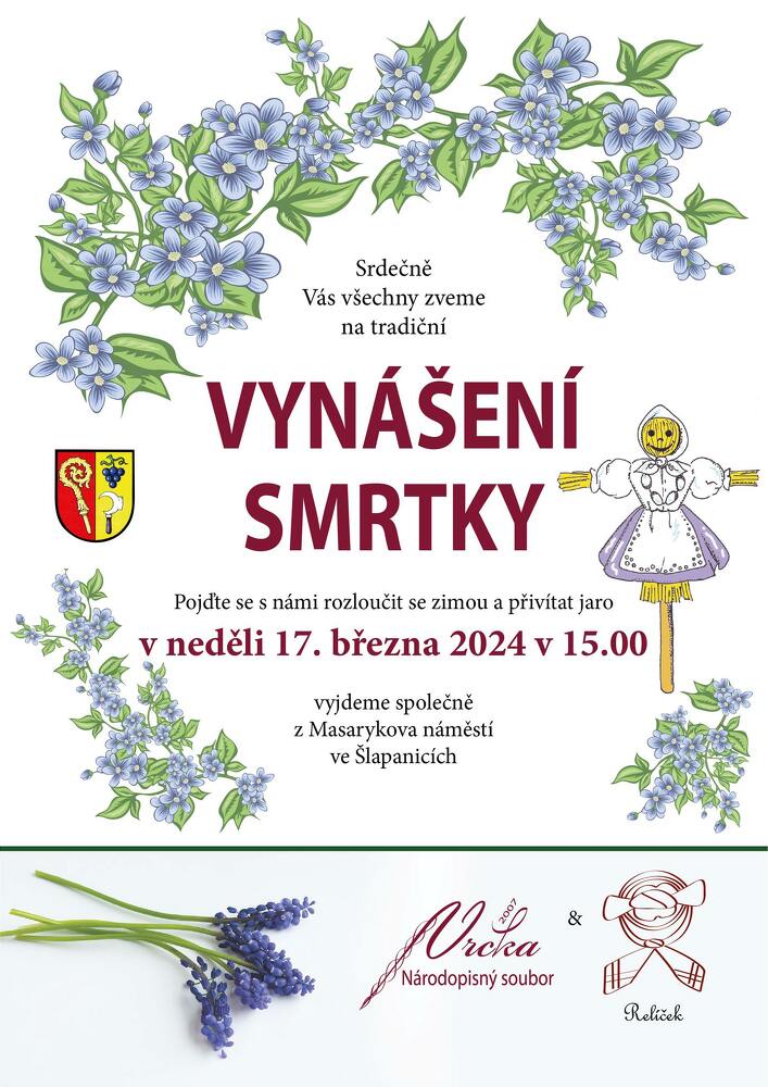 Pojďte se s Národopisným souborem Vrčka projít Šlapanicemi. Sejdeme se v 15.00 hodin na náměstí a za zpěvu obřadních písní dojdeme až k potoku, kde vyhodíme Smrtku. Odneseme zimu a všechno zlé a přivítáme jaro.