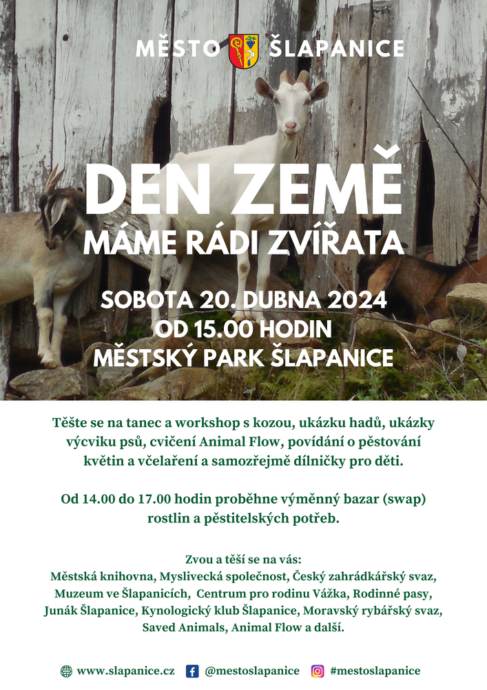 V sobotu 20. dubna zavítejte do městského parku. Od 14 hodin se můžete těšit na tanec a workshop s kozou, ukázku hadů, ukázky výcviku psů, cvičení Animal Flow,