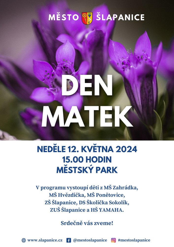 Na počest svátku všech maminek vystoupí v neděli 12. května v městském parku děti místních škol i školek se svými písničkami a tanečky. Začínáme od 15 hodin.
