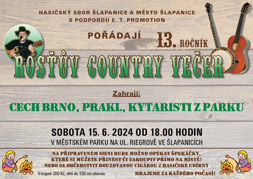 Na již 13. Ročník tradičního Rosťova Countryvečera se můžete těšit druhý červnový víkend ve Šlapanickém městském parku!