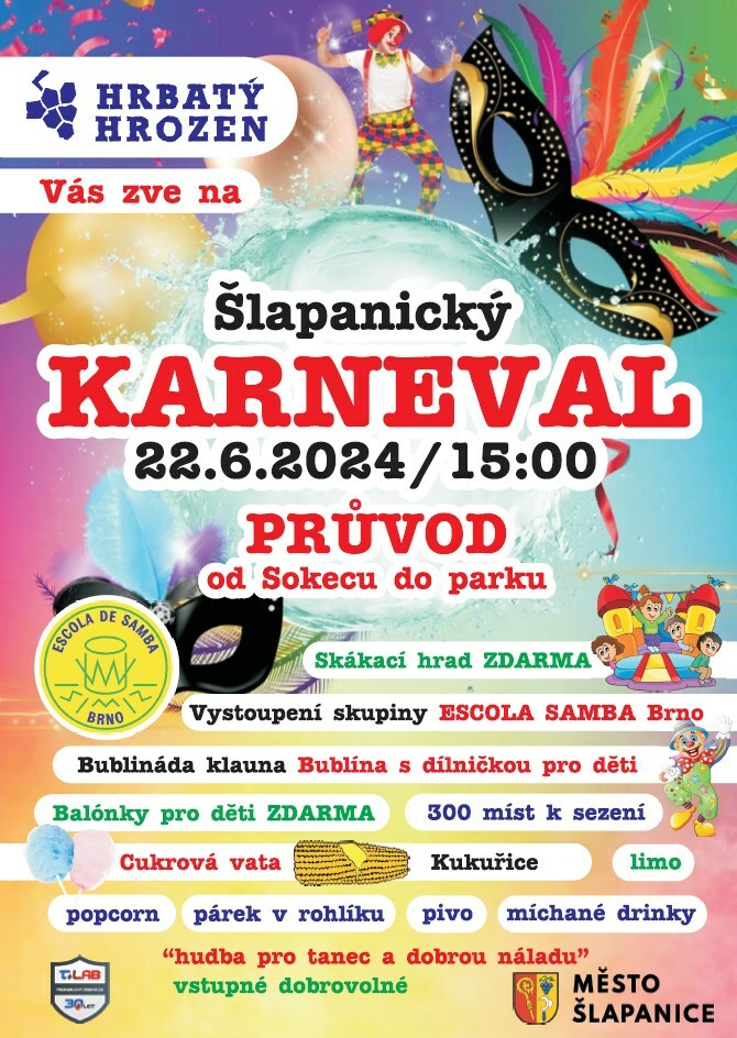 Tradiční šlapanický karneval nás čeká v sobotu 22.6.2024. Průvod vychází od Sokolovny do parku, kde bude navazovat další doprovodný program. Zapojte se jako maska nebo divák a otevřete s námi léto.