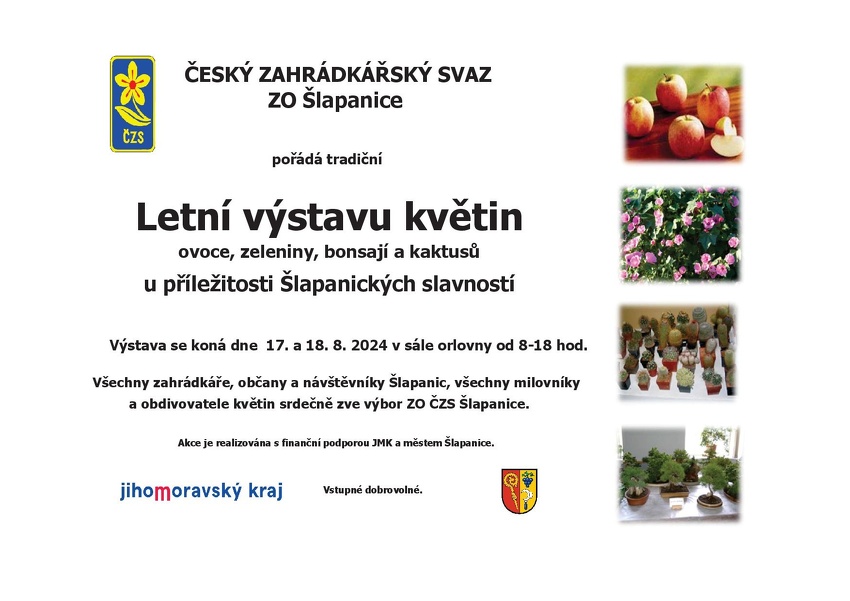 Naši zahrádkáři vás v rámci šlapanických slavností zvou na Letní výstavu květin, která bude k vidění v sále Orlovny 17. a 18. srpna od 8 do 18 hodin.