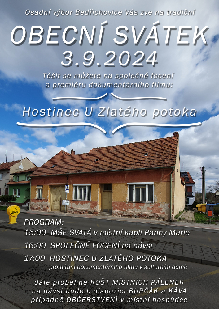 Osadní výbor Bedřichovice Vás zve na tradiční Obecní svátek, který se bude konat v úterý 3. září 2024 od 15 hodin.