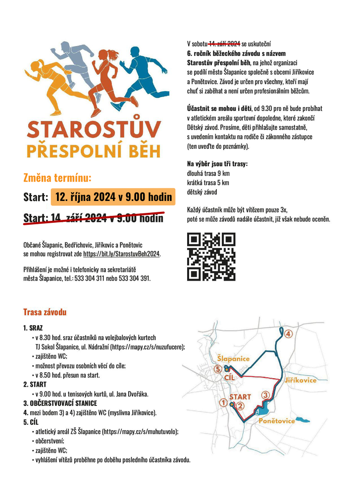 Pokud jste se již přihlásili a nemůžete se v uvedeném termínu zúčastnit, prosíme Vás o odhlášení ze závodu na telefonu 533 304 311 nebo e-mailu: sekretariat@slapanice.cz. Program akce zůstává beze změny, více zde: https://www.slapanice.cz/starostuv-beh/.