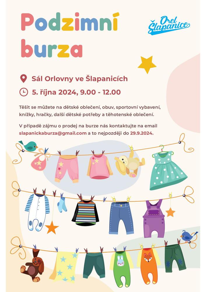 V sobotu 5. října se můžete těšit v sále Orlovny na prodej dětského oblečení, obuvi, sportovního vybavení a dalšího. V případě zájmu o prodej na burze kontaktujte e-mail: slapanickaburza@gmail.com a to nejpozději do 29.9.2024.