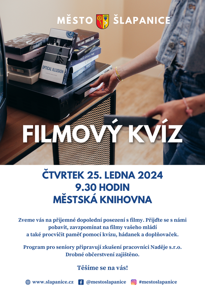 Máte rádi filmy, rádi si o nich vyprávíte a ještě raději v tomto tématu soutěžíte? Nenechte si ujít filmový kvíz, který odstartujeme pro všechny seniory, ve čtvrtek 25. 1. 2024 v městské knihovně od 9.30 hodin.