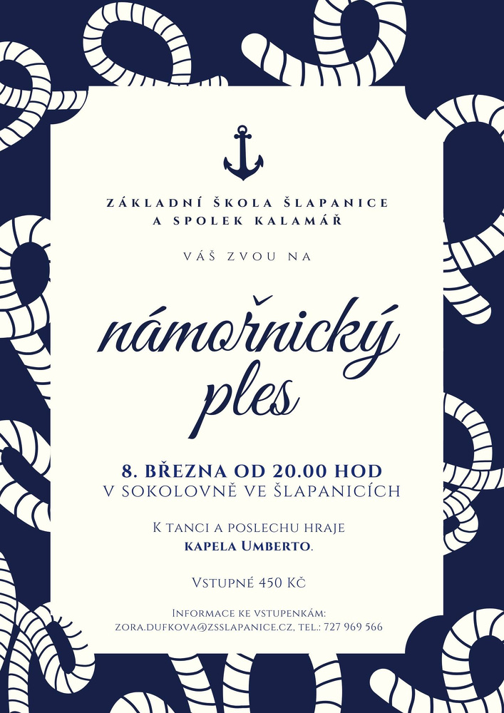 Základní škola Šlapanice a spolek Kalamář vás zvou na námořnický ples v pátek 8. března od 20 hodin na Sokolovně.