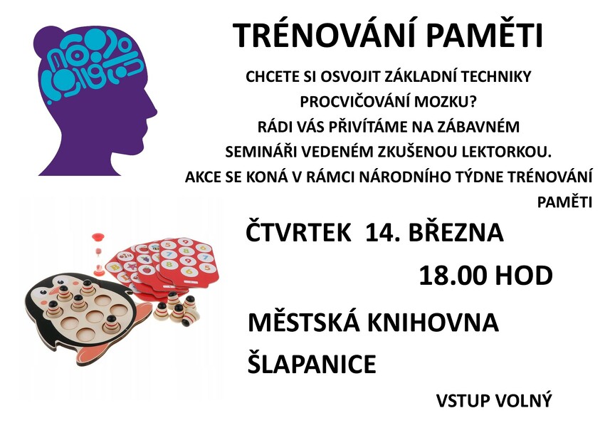 Přijďte potrénovat vaši pamět na zábavný seminář vedený zkušenou lektorkou. Akce koná ve čtvrtek 14. 3. 2024 od 18:00 v městské knihovně.