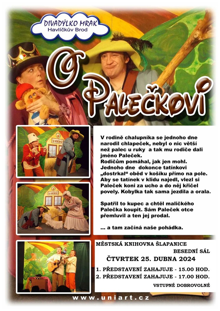 Městská knihovna Šlapanice vás zve ve čtvrtek 25. dubna na pohádku O Palečkovi. Divadlo Mrak hraje v 15.00 a druhé představení v 17.00 hodin. Vstupné dobrovolné.