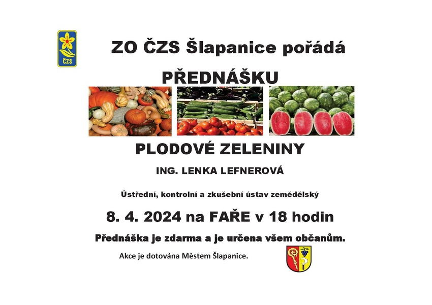 Zahrádkáři Šlapanice vás srdečně zvou na přednášku věnovanou plodové zelenině. Přednášející Ing. Lenka Lefnerová vás čeká 8. 4. 2024 na Faře od 18 hodin. Přednáška je zdarma.