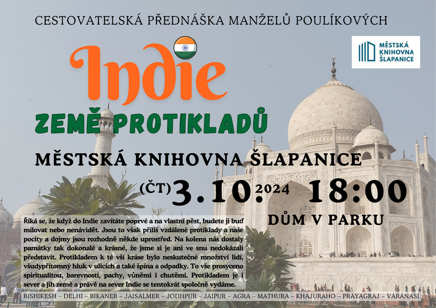 Vydejte se spolu s námi na cestu. Manželé Poulíkovi nás provedou severem Indie ve čtvrtek 3. října v 18 hodin v sále městské knihovny.