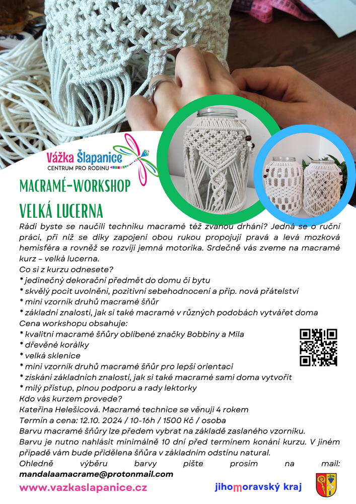 Rádi byste se naučili techniku macramé též zvanou drhání? Srdečně Vás zveme na macramé kurz – velká lucerna v centru pro rodinu Vážka