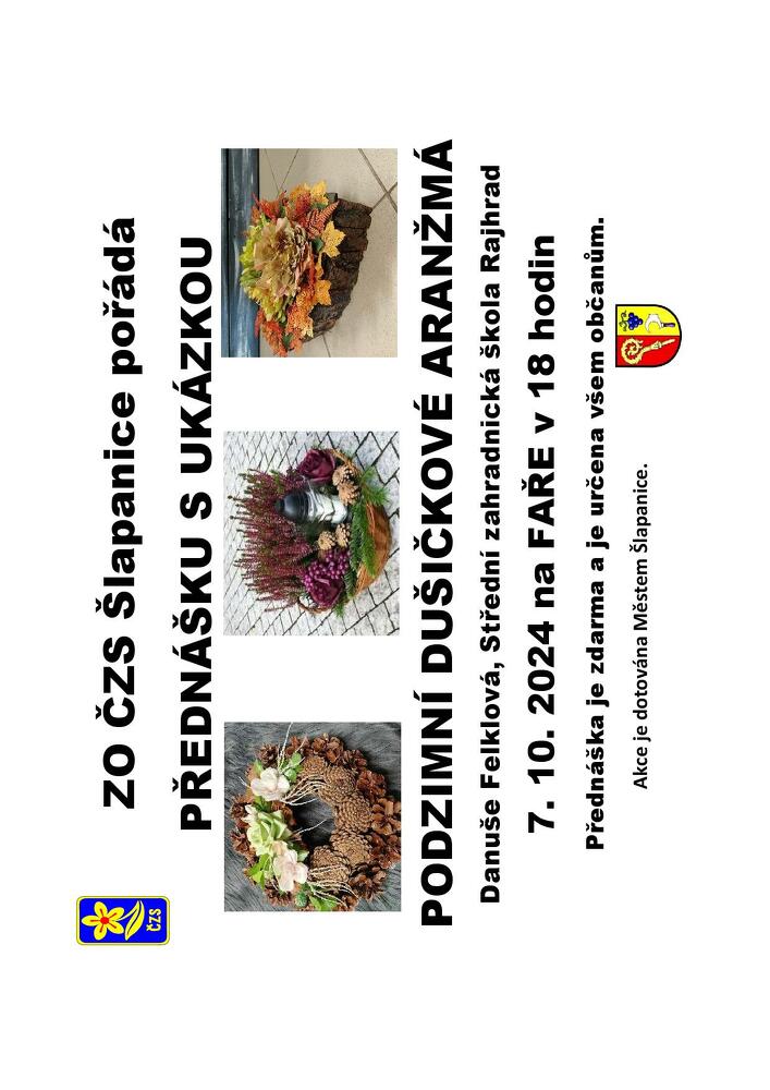 Pokud se chcete zdokonalit v podzimních výzdobách nenechte si ujít přednášku zahrádkářů na téma Podzimní dušičkové aranžmá. Už v pondělí 7. října bude přednášet Danuše Felklová ze střední zahradnické školy Rajhrad. Přednáška začíná v 18 hodin a je zdarma.