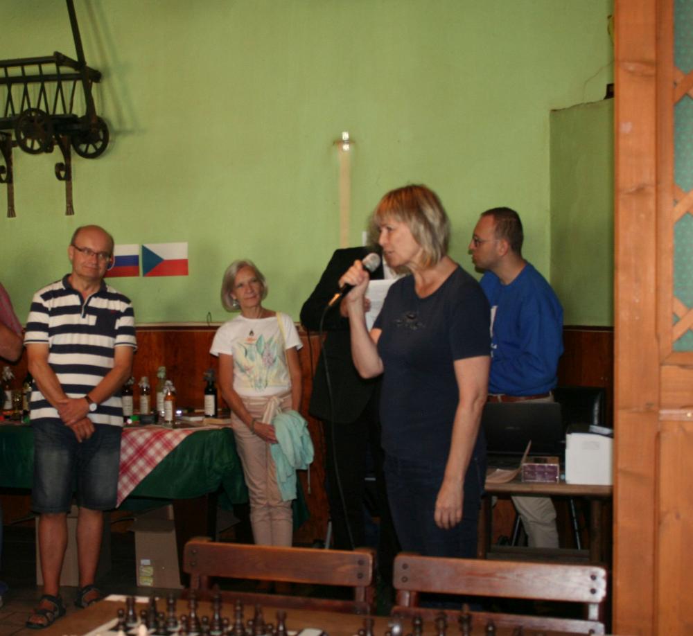 1) Pozdrav starostky Šlapanic Michaely Trněné. U stolku s cenami dnes již nehrající mistryně FIDE Libuše Skácelová, roz. Záhorovská, která v 70. a 80. letech patřila k československé špičce ženského šachu.