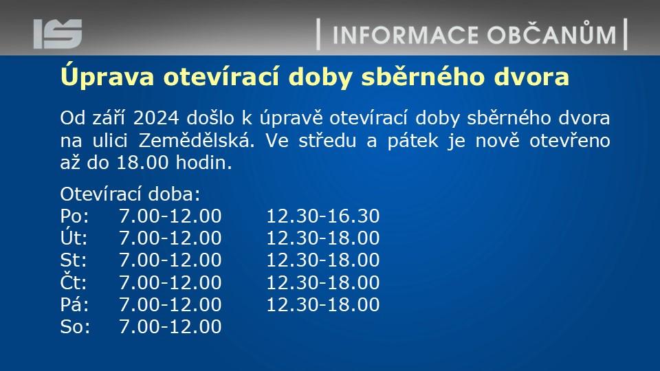 Není úřední den. Je otevřena pouze pokladna (8 - 12 hod.), podatelna (8 13 hod.) a přepážka Odboru správních činností - Czech Point, ověřování podpisů a listin (8 - 13 hod.) na pracovišti MěÚ Šlapanice, Opuštěná 9/2, Brno.