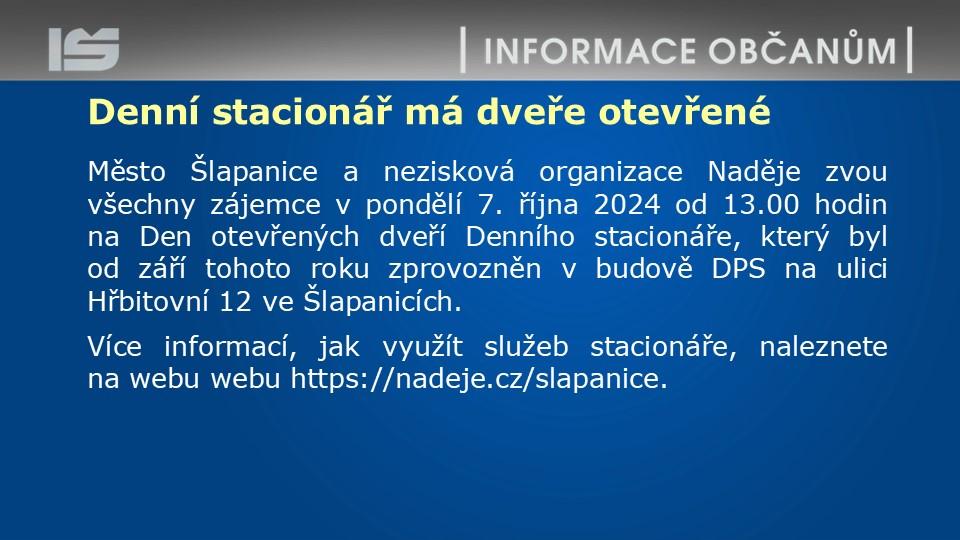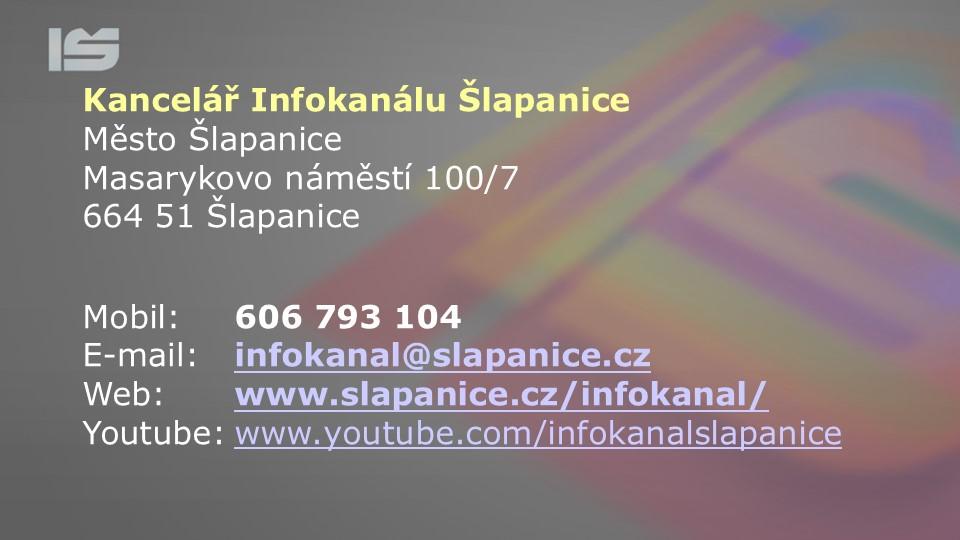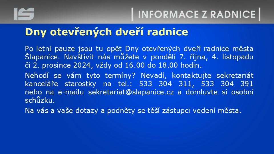 Není úřední den. Je otevřena pouze pokladna (8 - 13 hod.), podatelna (8 13 hod.) a přepážka Odboru správních činností - Czech Point, ověřování podpisů a listin (8 - 11 hod.) na pracovišti MěÚ Šlapanice, Masarykovo nám. 100/7, Šlapanice.